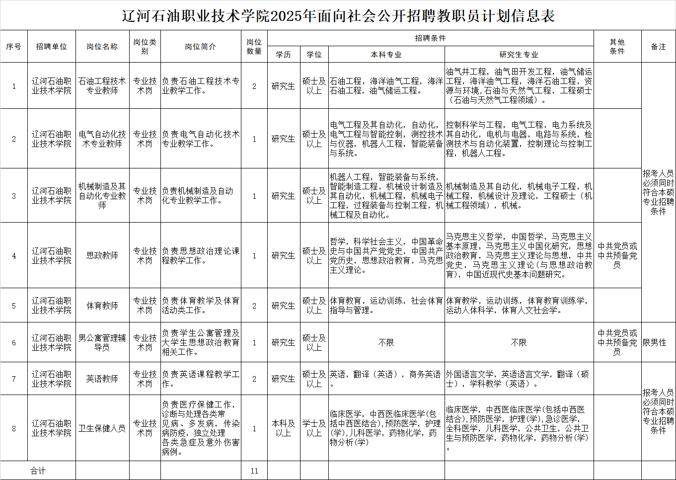 (五)岗位所需要的其他条件,详见《辽河石油职业技术学院2025年面向社会公开招聘教职员计划信息表》(附件1)。
