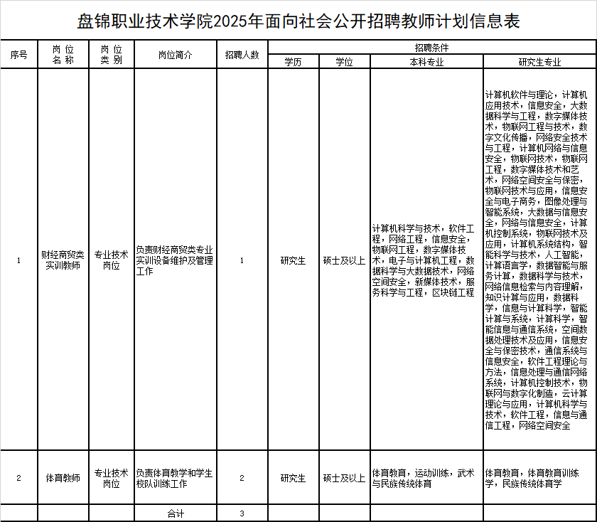 3.盘锦职业技术学院2025年面向社会公开招聘教师报名信息汇总表